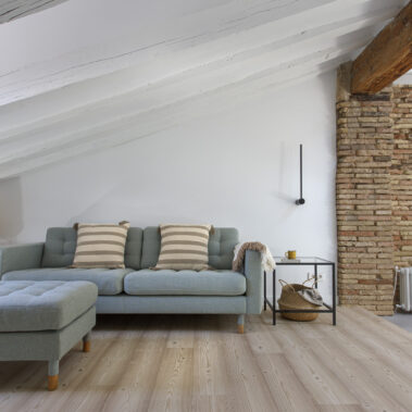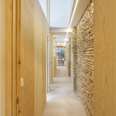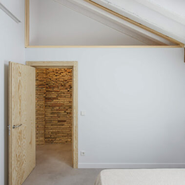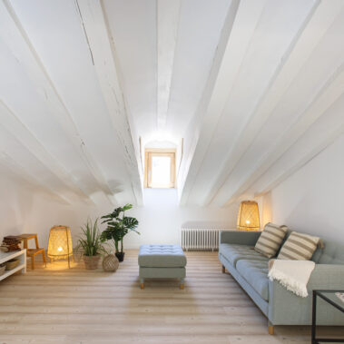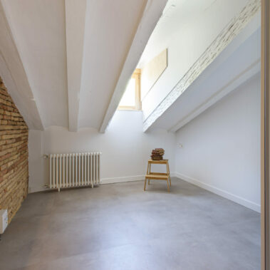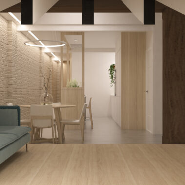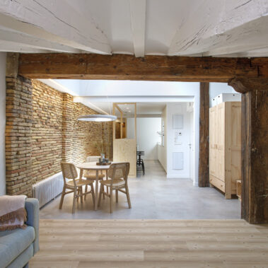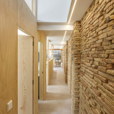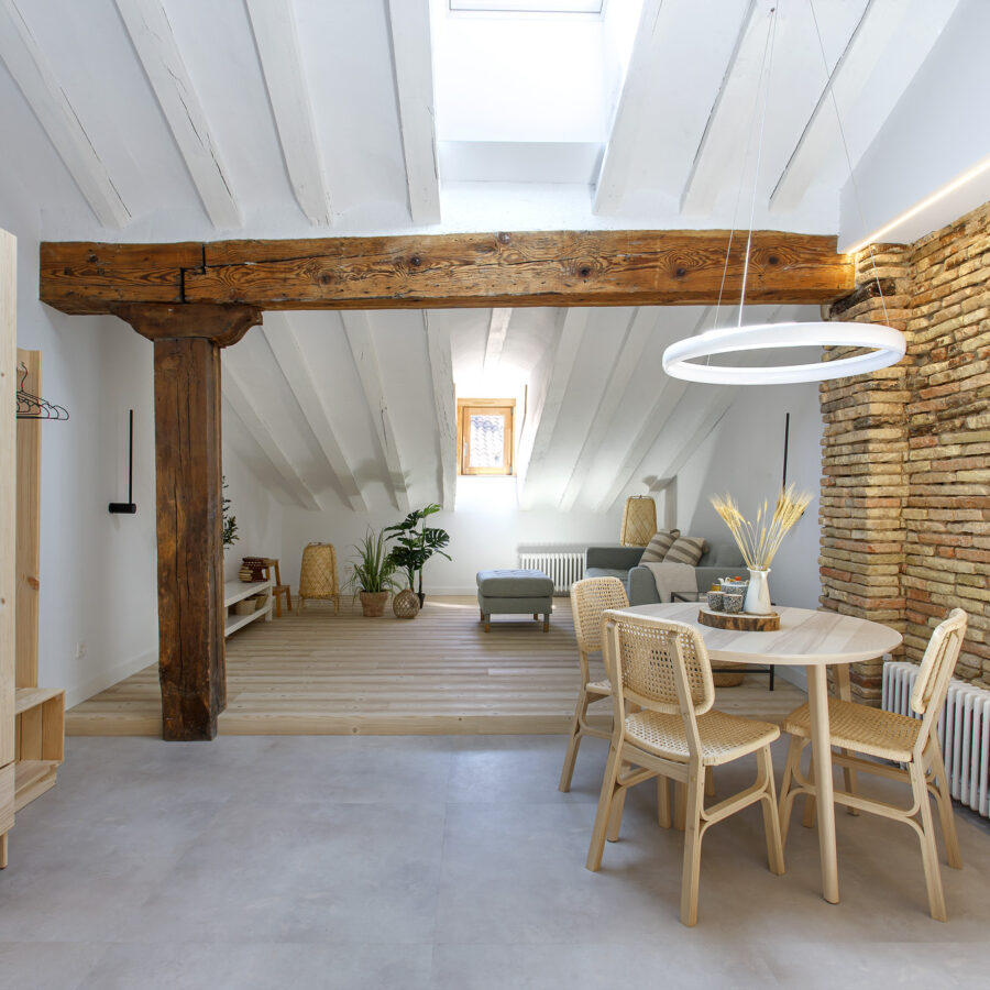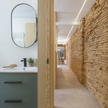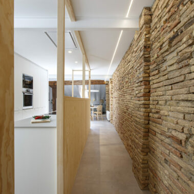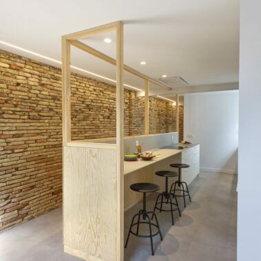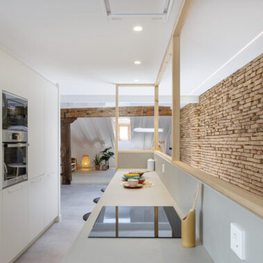 Uno de los grandes protagonistas de la reforma es la recuperación de los materiales originales. Los elementos estructurales vistos, junto con la cubierta expuesta, otorgan carácter y realzan la esencia del edificio. La presencia de una pared de ladrillo recuperada aporta textura y calidez, estableciendo un diálogo con el resto de materiales.