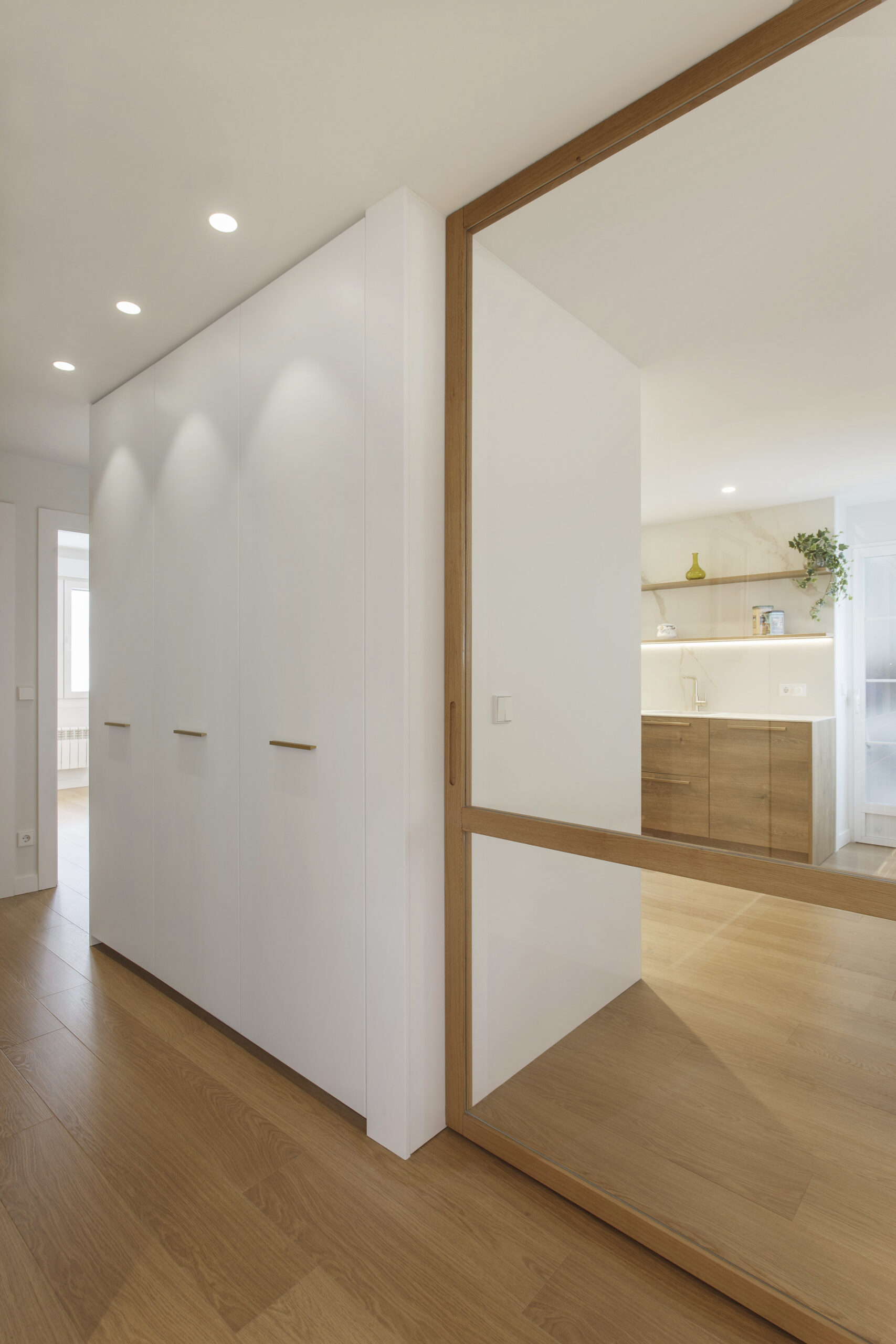 La zona pública se compone de recibidor, cocina, salón y comedor, conectados para fomentar amplitud y fluidez. La cocina, separada con un cierre de madera y cristal, permite el paso de luz natural manteniendo la delimitación de espacios.