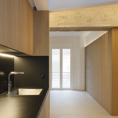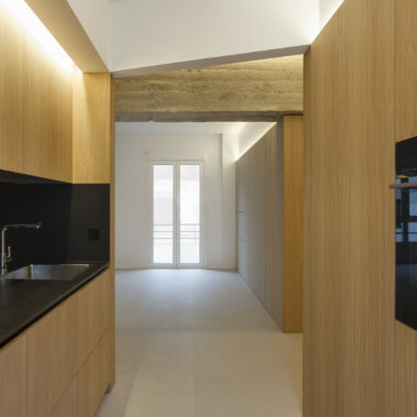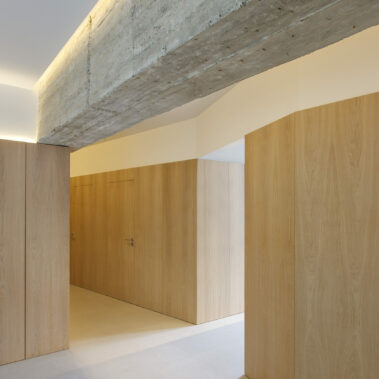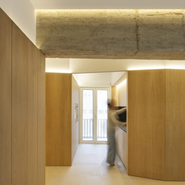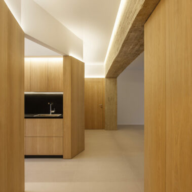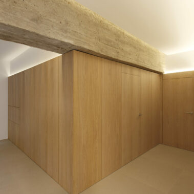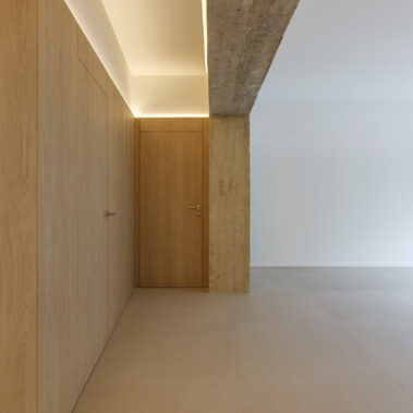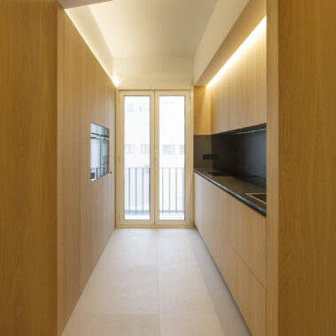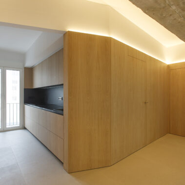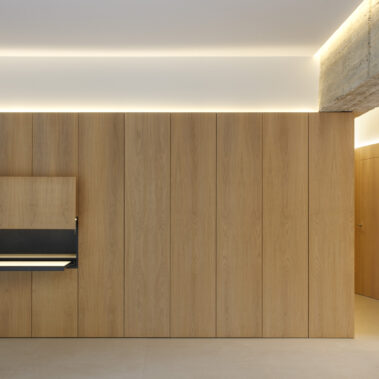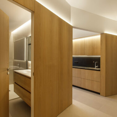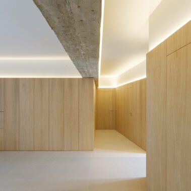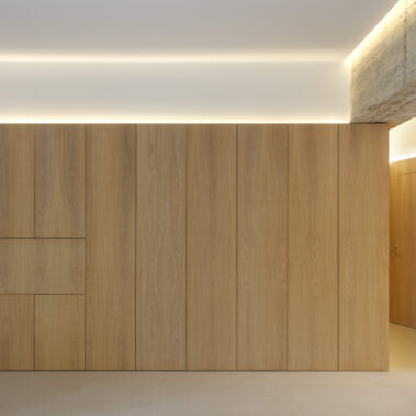 Esta reforma se caracteriza por un diseño minimalista y elegante, donde la pureza de las líneas y la calidez de los materiales se combinan para crear un ambiente armónico y funcional. El espacio se define por un revestimiento continuo en madera natural, que envuelve paredes y puertas con un acabado impecable, logrando uniformidad visual y ocultando elementos funcionales mediante paneles integrados. La madera, de tonalidad clara, aporta calidez y contrasta sutilmente con el pavimento cerámico en tonos neutros, que refuerza la sensación de amplitud y luminosidad.