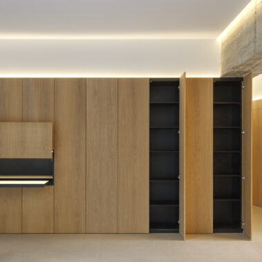Entre los paneles, se esconde un módulo funcional con apertura abatible, que revela un espacio de trabajo o almacenamiento, manteniendo la limpieza visual cuando está cerrado. El conjunto transmite una sensación de orden, modernidad y cuidado artesanal, combinando diseño contemporáneo con materiales nobles para lograr un resultado atemporal y de alta calidad constructiva.