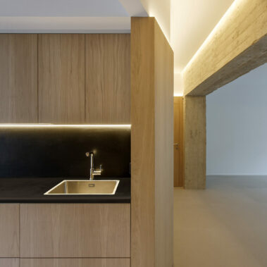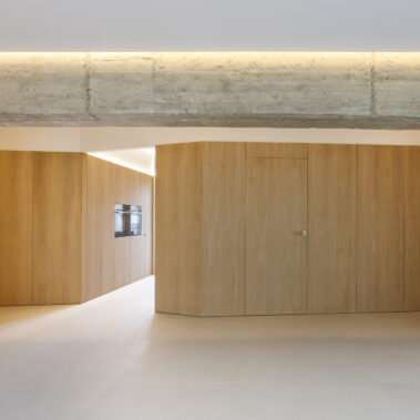 El techo incorpora una iluminación indirecta lineal que recorre todo el perímetro, aportando una luz suave y homogénea que realza las texturas y genera un ambiente acogedor. Un detalle distintivo es la viga de hormigón visto, que atraviesa el espacio como un elemento estructural y estético, aportando un contrapunto industrial al conjunto.