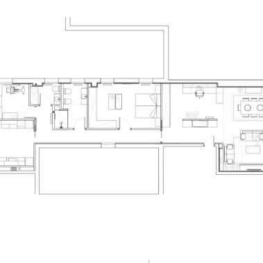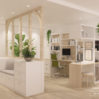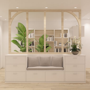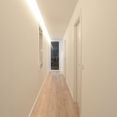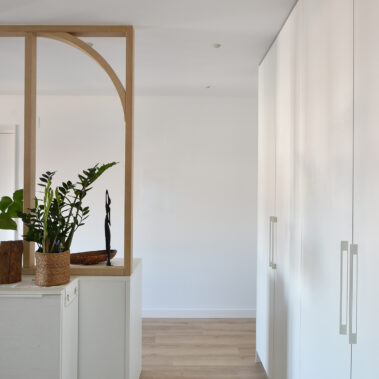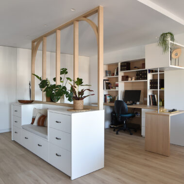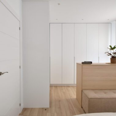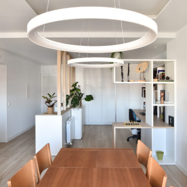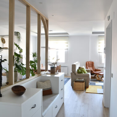 En la nueva distribución optamos por unir el recibidor con el estudio por medio de un mueble auxiliar de cajones y un cerramiento de madera vacío. Conectados con este espacio también se encuentran el salón y el comedor, enmarcados con unas fosas en el techo a modo de “alfombras”.
