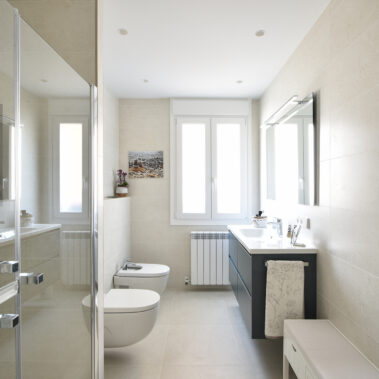 Los baños están revestidos con una cerámica limpia y atemporal que dialoga perfectamente con el resto de la vivienda.